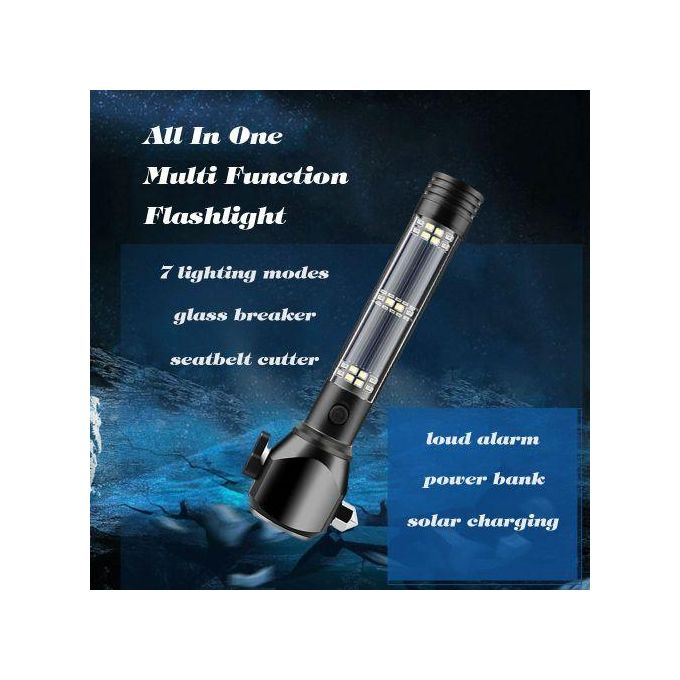 Super Bright Solar Torch With Mobile ChargerThis modern solar torch flashlight is the most advanced torch available of its class today. It is equipped with multi features you can’t get anywhere else.Multi Function Flash Light, USB Rechargeable Solar Powered Flashlight with Glass Breaker, Seatbelt Cutter, Alarm and Phone Charger, Car LED Tactical Flashlight for EmergenciesBuilt with car owners at heart, this torch is equipped with bright white light, and blue – red light for emergency use, hammer for breaking glass in case of jammed doorsVery loud alarm for rescueThe Solar Flashlight Torch with Mobile Charger is equipped with 7 light modes namely:-Headlight high/medium/strobe, side white light high/medium , side red flash and slow flash.-The solar powered rechargeable flashlight is not just for car emergencies, but also great for working, camping, or hiking. The solar flashlight can also be used in an emergency through the safety hammer on the left side of the torch.[Appearance] Gentleman-like atmospheric black, easy-to-grab non-slip handle, simple-to-recognize operation buttons, at a glance will fall in love with this rechargeable car flashlight.[Multi Function] Outstanding USB/solar dual rechargeable flashlight with 7 working modes(Headlight-High, Medium and Strobe, White sidelight- High and Medium, SOS mode-flashing red and blue alternately like a police light. It can also play the role of window breaker, seatbelt cutter, 120DB alarm and even power bank. A tactical flashlight for camping, hiking, or outdoor survival challenging.[Storage] Strong magnets make it possible hang in the car and the glove box is also a good choice. Please be sure to place it in a conspicuous and accessible place for fast escape. This solar patriot flashlight is portable with lanyard so that you can hang it up everywhere.[Package] Independent and exquisite packaging, which is very suitable for gifts or personal use. A special present for your family-full of love and tenderness. This roadside hero flashlight is exactly what you are looking for to increase safety confidence in your car…