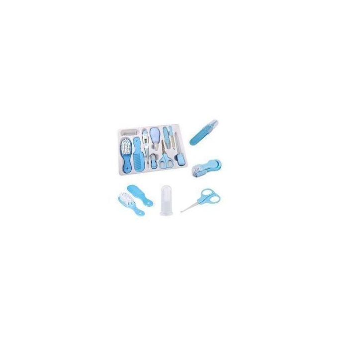 Includes: soft-bristled hair brush, comb with non-scratching rounded teeth, curved nail clippers, scissors with rounded tips, scissors,  cutter, and a hygienic transparent plastic storage case