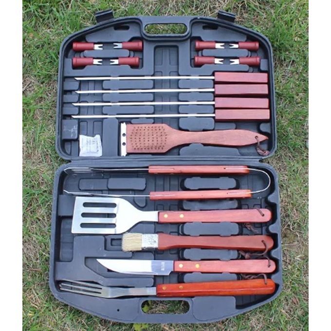 steel barbecue set has wooden handles for cool touch cooking. The serious barbecue cook has everything they need with this 18 piece set that includes barbecue fork, all purpose knife, gourmet basting brush, slotted turner, heavy duty tongs, 4 piece barbecue skewers and 8 piece corn holders. When you are finished, the heavy duty grill cleaning brush helps with the clean up. All pieces fit neatly into the molded plastic storage case, ready to use next time.