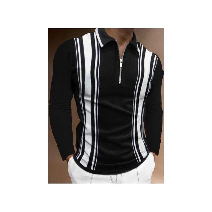 Berrykey Men’s Striped Shirts Long-sleeved Polo Shirt – Black