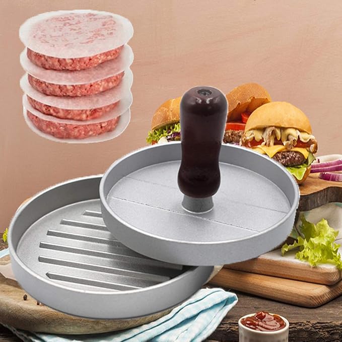 Burger Press waa qalab loogu talagalay in lagu sameeyo burger siman oo isku dhumuc ah, si xirfadaysan oo u eg kuwa restaurant-ka. Waxaa laga sameeyey bir adag ama plastic tayo sare leh oo u adkeysanaya culeyska riixitaanka. Qalabkani wuxuu kuu fududeynayaa inaad hilibka si siman ugu cadaadiso, si uu u noqdo burger isku dhumuc ah oo si fiican u bislaada. Naqshaddiisu waxay ka hortagtaa in burgerku uu kala jabto marka la shiilayo ama la dubayo.