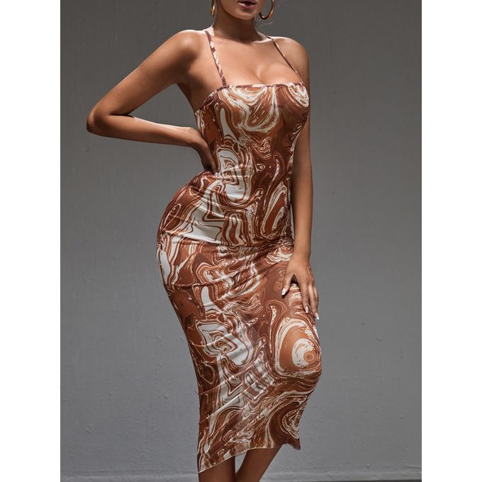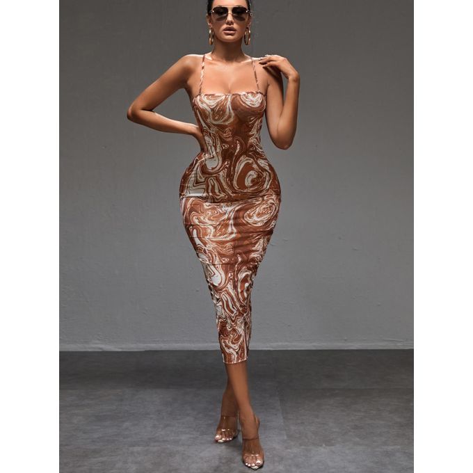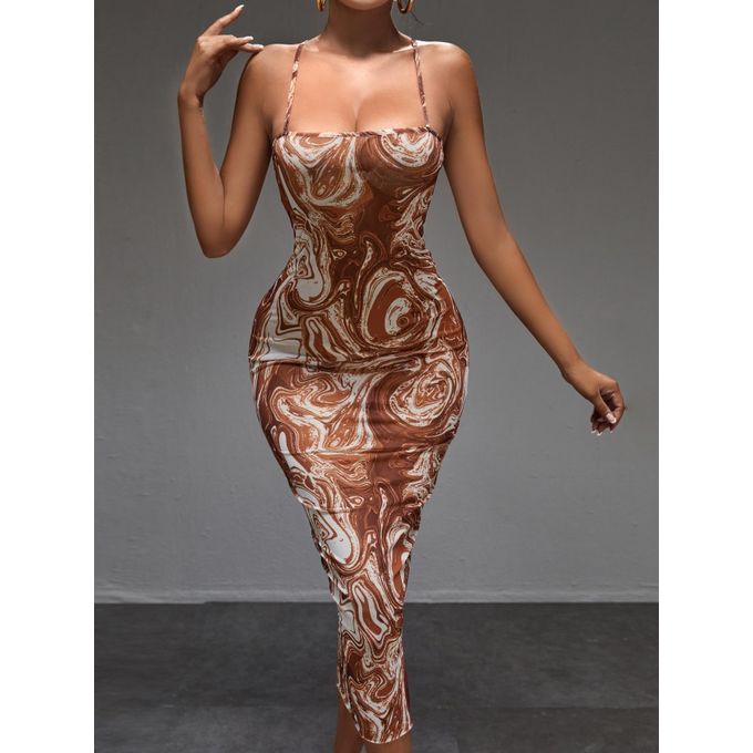 CALLIARA Elegant Women’s Marble Print Spaghetti Strap Bodycon Midi Dresses for Ladies