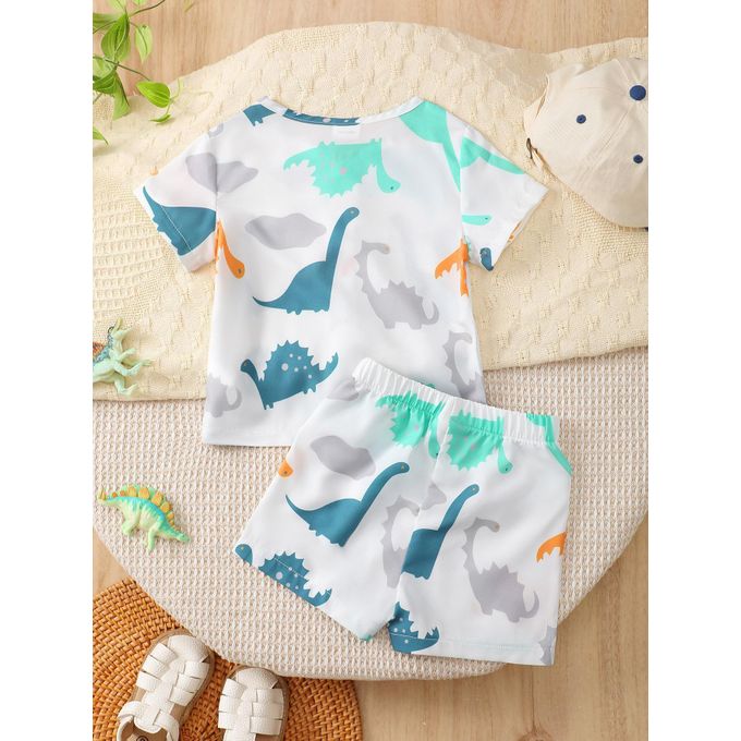 Catpapa 2-Piece Summer Loungewear Set for Baby Boys 3-24 Months – Cartoon Dortinosaur Print Round Neck Sh-Sleeve Top & Shorts