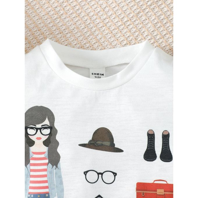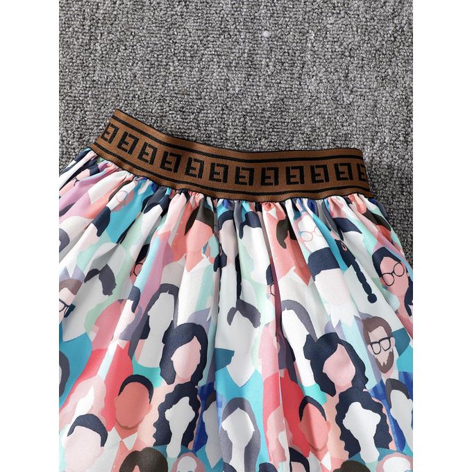 Catpapa 2-Piece Summer Outfit for Girls 4-7 Years – Cartoon Print Short-Sleeve Top & Portrait All-Over Print Skirt