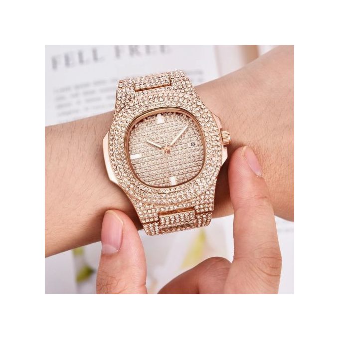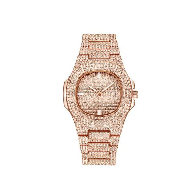 Hip Hop Iced Out Watch Quartz Luxury Full Diamond Round-Rose Gold