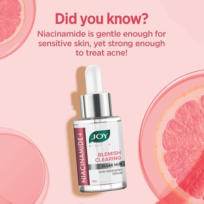 Joy Revivify Niacinamide+ Blemish Clearing Clear Skin Face Serum (30 ml) waa serum awood sare leh oo si gaar ah loogu talagalay in uu nadiifiyo maqaarka, u yareeyo finan iyo dhibco madow, isla markaana uu hagaajiyo dhismaha iyo dhalaalka guud ee wajiga. Qaacidada serum-kan oo ku dhisan Niacinamide xoog leh iyo maaddooyin nadiifin ah ayaa ka shaqeeya qoto dheer oo gudaha maqaarka ah si ay u hagaajiso midabka, u dejiyaan cuncunka, una yareeyaan muuqaalka pores-ka furan.