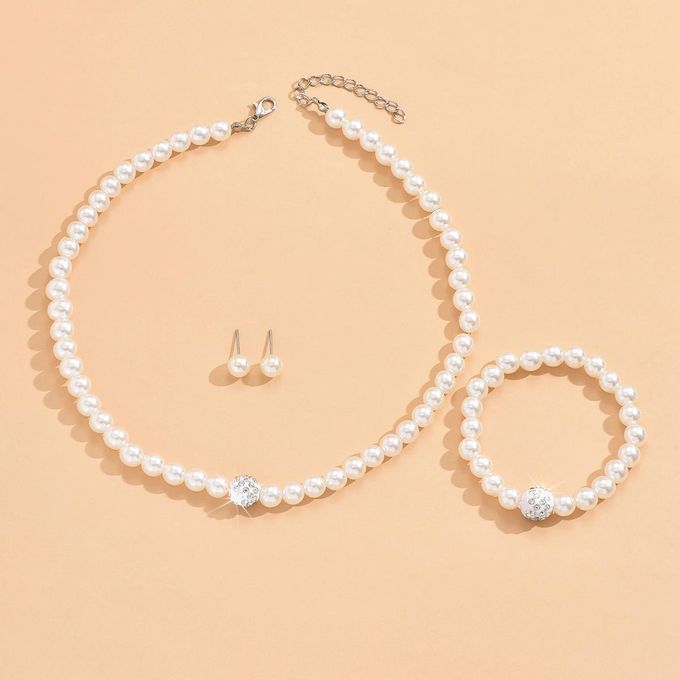 Ladies Artificial Pearl Necklace Bracelet Ear Stud Jewelry Set 3 In 1