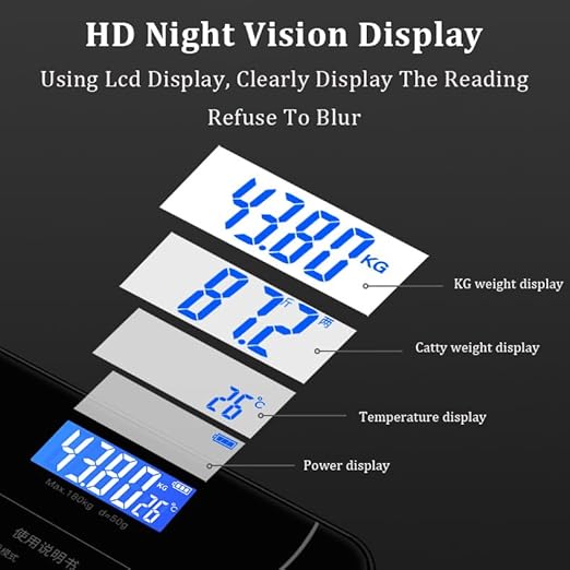 Scale-kan digital-ka ah wuxuu qaadi karaa ilaa 180KG. Wuxuu leeyahay screen weyn, cabbir sax ah, iyo badhan dareere ah. Waa ku habboon guriga iyo isticmaalka qof kasta oo raba inuu helo xog miisaankiisa saxda ah.