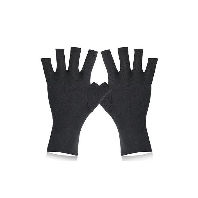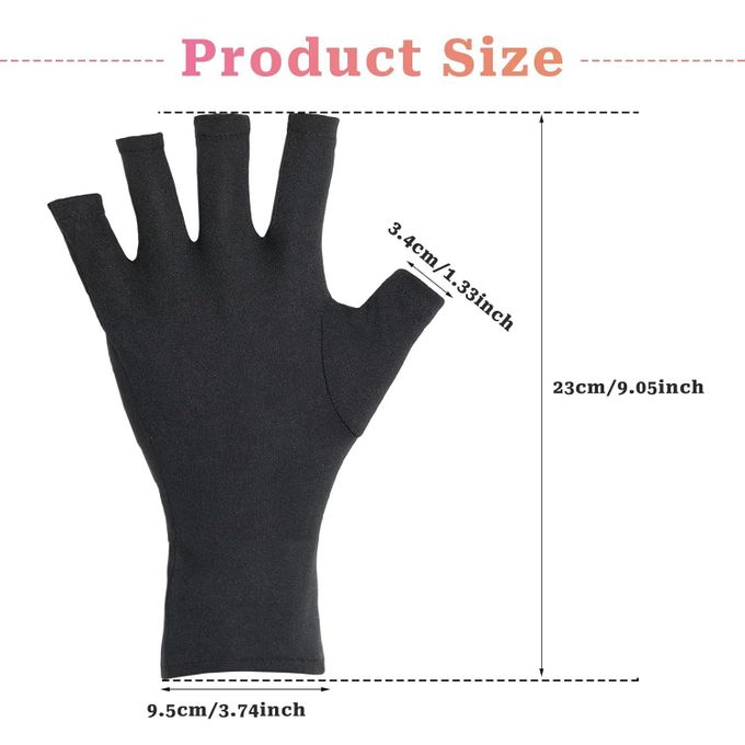 These are specialized UV protection gloves designed for use during gel nail curing under a Nails Lamp. They function as a UV shield to protect the hands and skin from potential UV/LED exposure. The gloves are fingerless, which allows the fingernails to remain exposed for the manicure process while the rest of the hand is covered. This makes them an essential accessory for professional manicures and nail art to ensure skin care and minimize UV damage. They are reusable and typically made of a soft, stretchy fabric for comfort.
