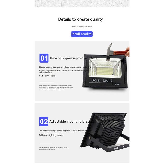 the solar flood light is waterproof, and can withstand rain, wind, snow, ice and wet conditions. Perfect for any outdoor location, such as the front door, back yard, porch, patio, barn, garage, pathway, driveway.
