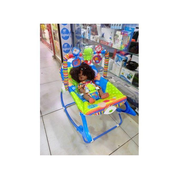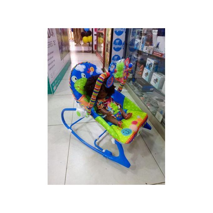 reclining infant seat with a fold-out kickstand—great for feeding baby. Adjust the seat upright so baby’s movements create rocking motion—with stimulating toys and music to enjoy. removable toy bar and switch to  calming vibrations. And as your child grows, it becomes a toddler rocking chair
